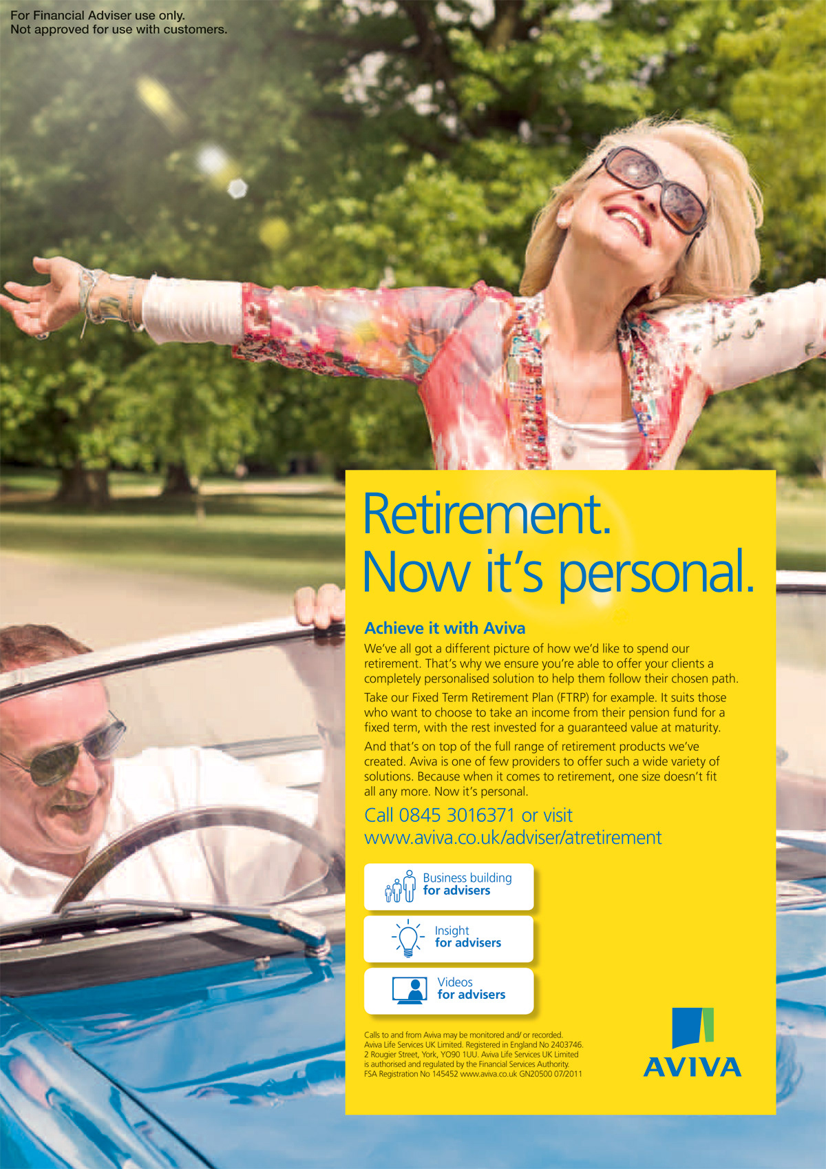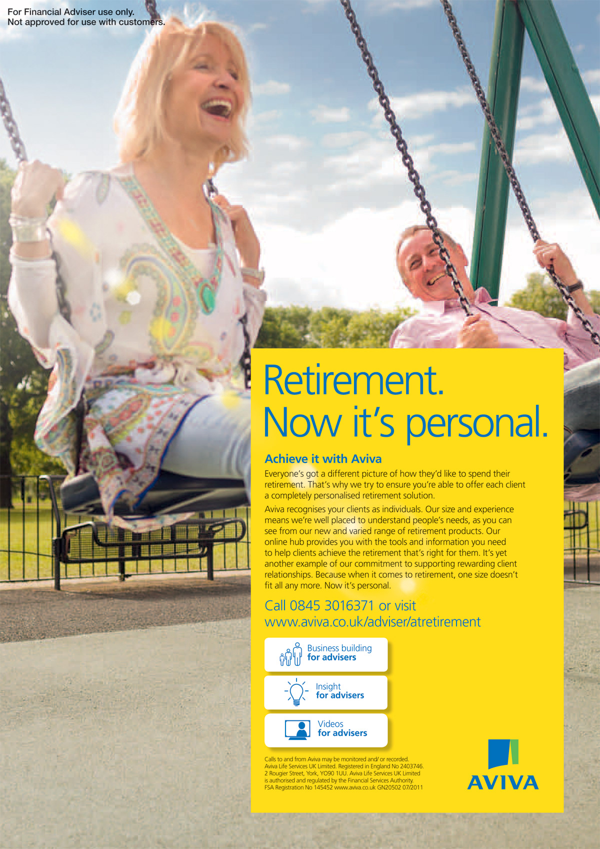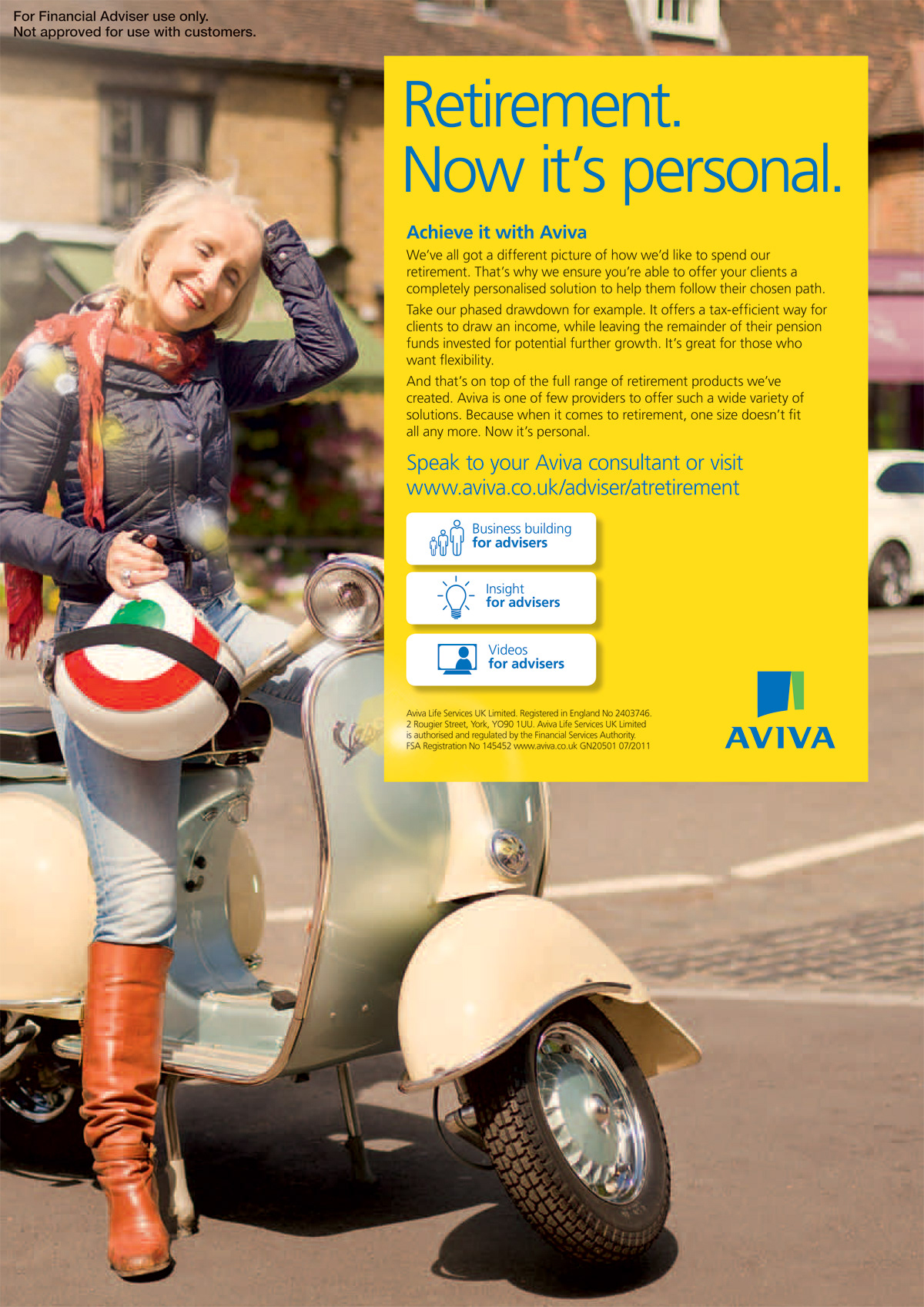 OOH, press and digital campaign. Until recently, a pension was a pension. There was very little choice available and a "one size fits all" approach was the norm. Aviva has altered their offering inline with today's expectations. Now you can 'personalise' you retirement to enjoy the most of your income. This press campaign makes a point of not showing 'happy old people' in clichéd scenarios.