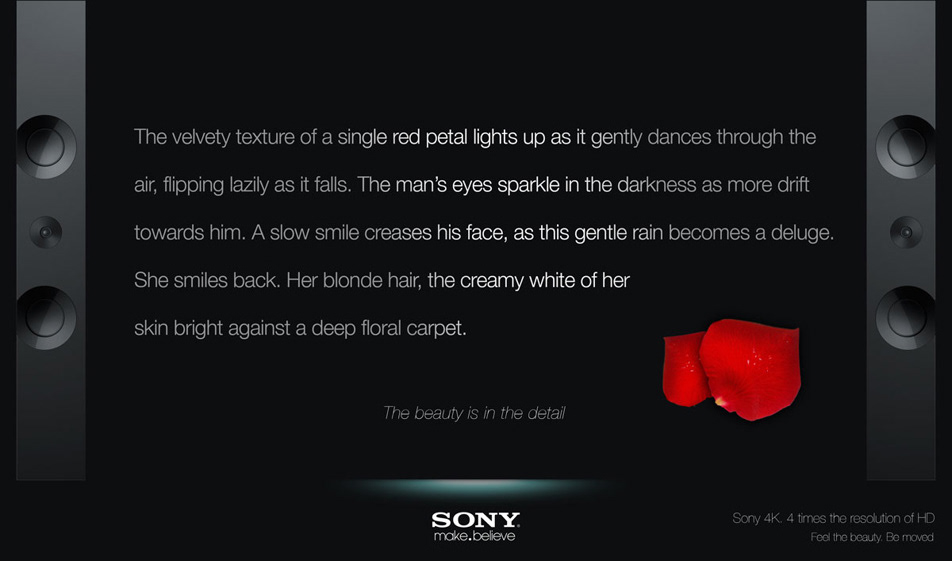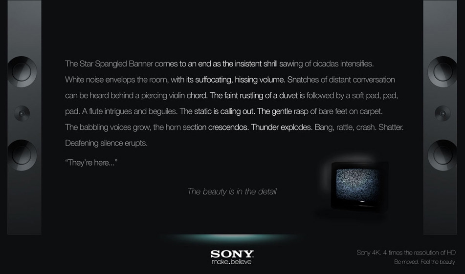 The sound quality of a Sony 4K TV is also something to talk about. To emphasise the sound as well as the resolution, without directly saying so, this execution recreates the scene using only descriptions of the sounds.